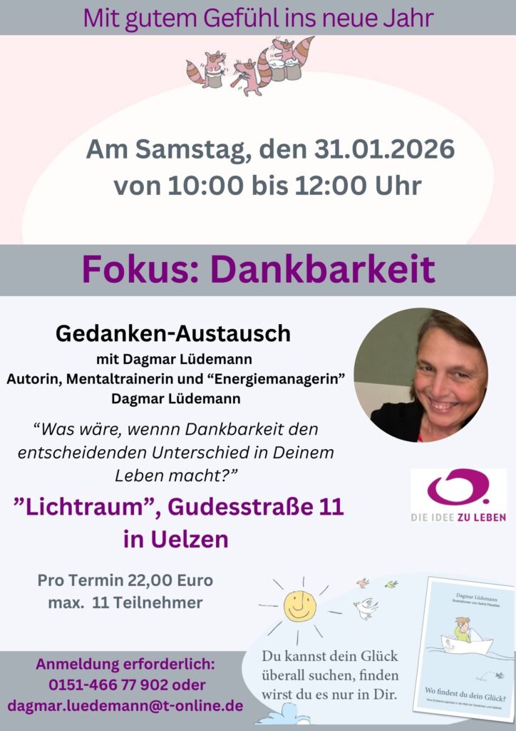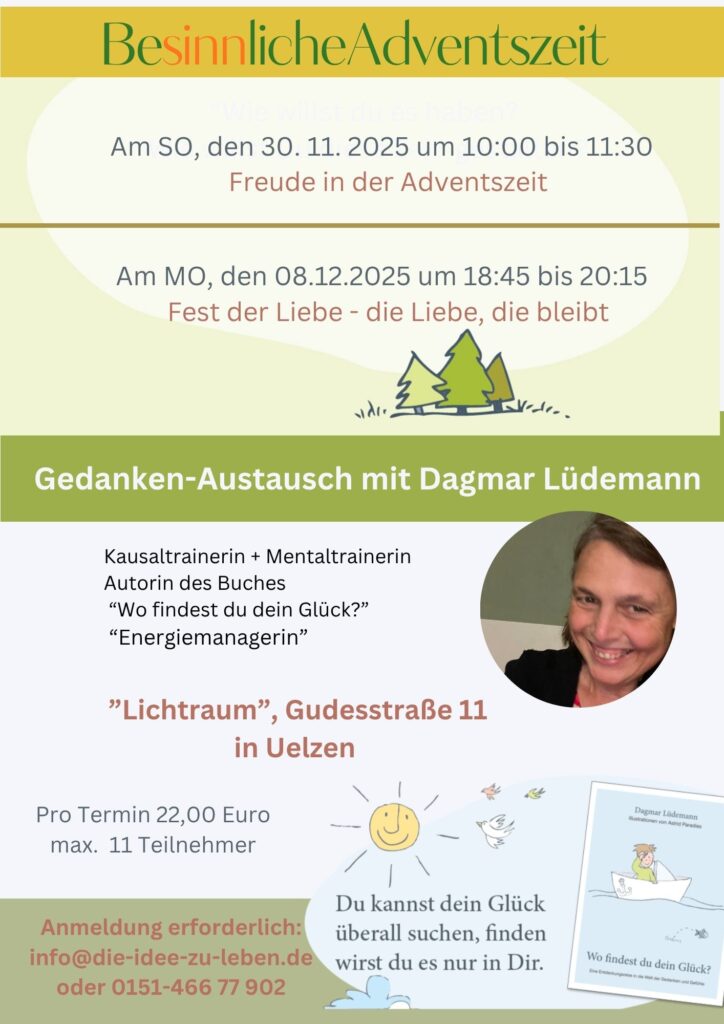 Mit all meinen Angeboten möchte ich Sie immer wieder daran erinnern, wie wichtig Ihre Gedanken und Gefühle in Ihrem Leben wirklich sind. Und ich möchte Sie ermutigen und unterstützen, die Ideen umzusetzen, die Ihnen am Herzen liegen.